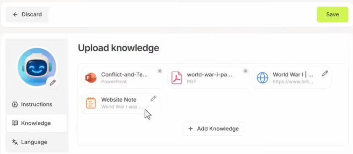 Edcafe AI lets teachers upload files, text notes, and webpages to build a restricted knowledge base for their chatbot